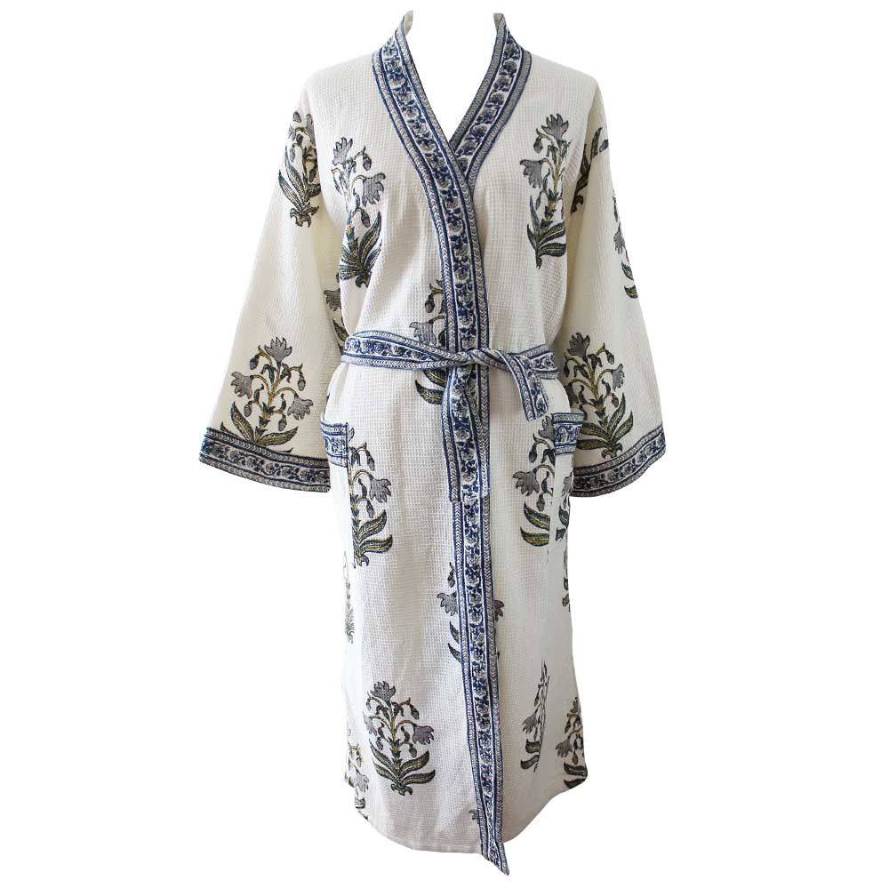 Our luxurious cotton waffle-textured bathrobe brings a spa vibe to the bathroom! The robe is printed with a large-scale botanical pattern and edged with a blue and grey border on the cuffs, pocket, and open front and has a matching tie belt.