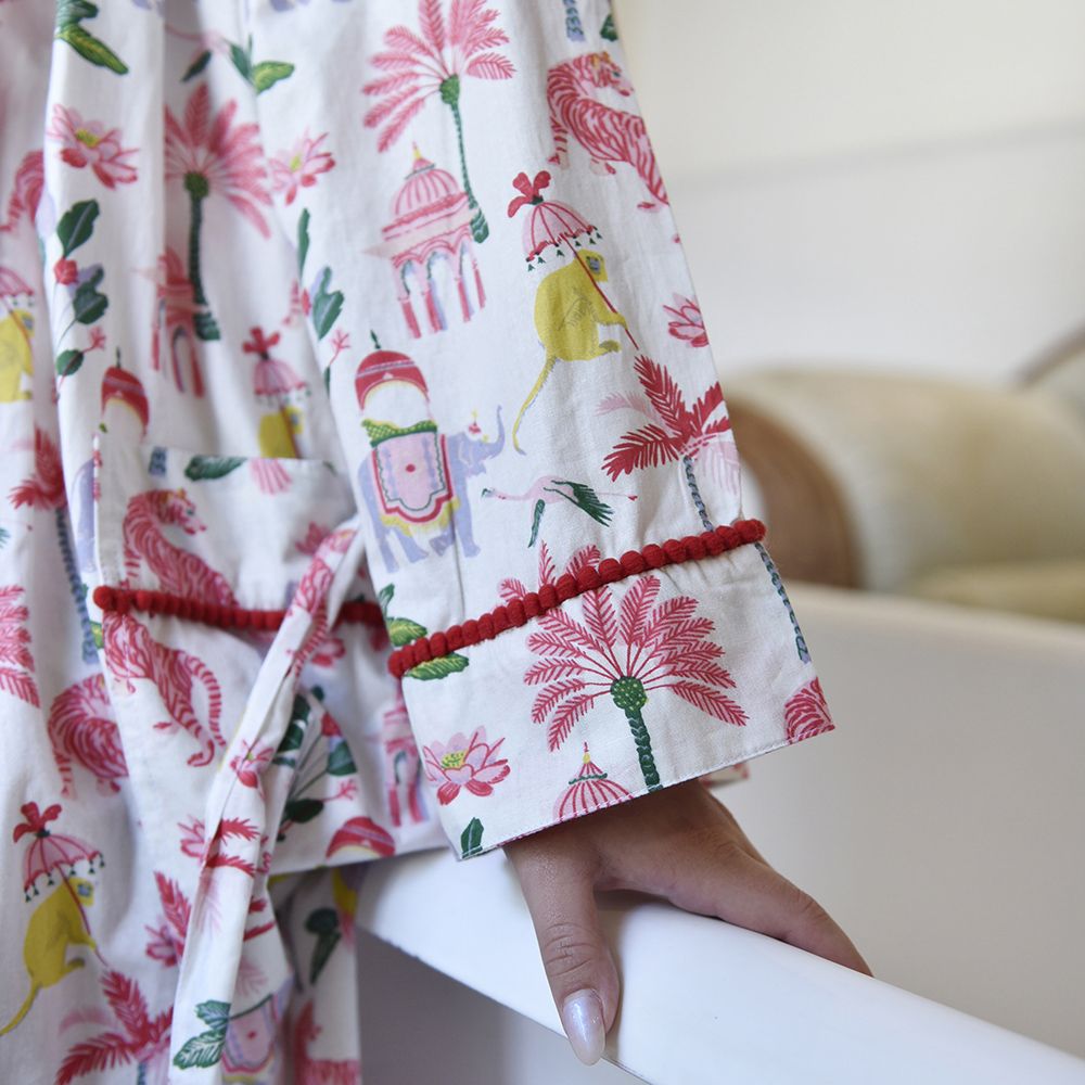 Make bedtime tropical with our Sultan’s Garden print dressing gown, a playful paradise of tigers, elephants, monkeys and cockatoos with beautiful palms, pagodas and lotus flowers set against a white background. The dressing gown is embellished with a red pom-pom trim on the cuffs, open front, and top of the pockets and it has a long matching waist tie belt.